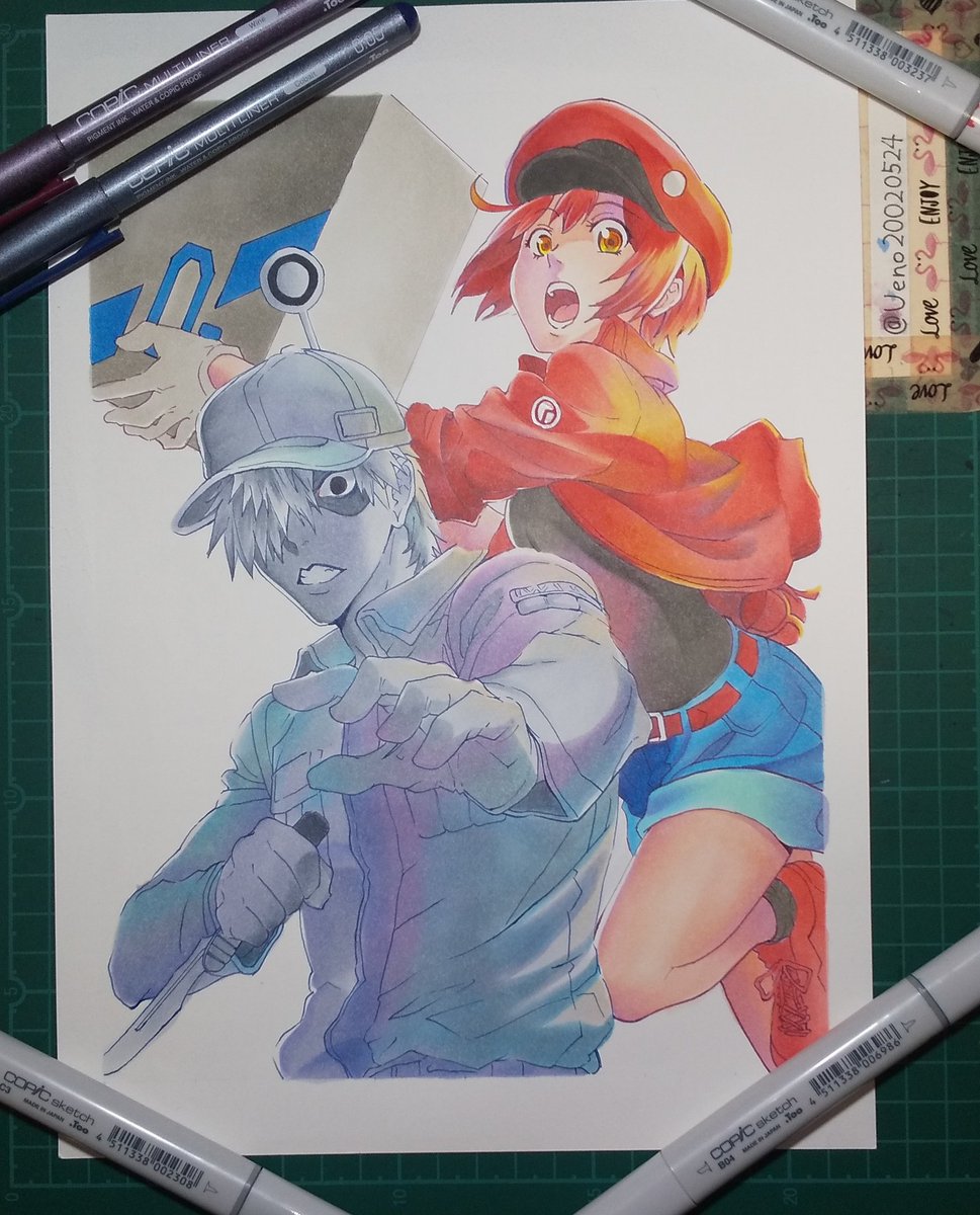 はたらく細胞 の放送開始を記念し 過去絵ですがコピックで赤血球と白血球さんを描 𝓢𝓸𝓾𝓷 のイラスト